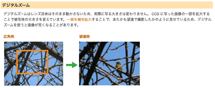 デジタルズームは撮った画像の一部を拡大するだけでいわば「トリミング」に近い方法でスマホで言うと画像をピントアウトするようなイメージです。