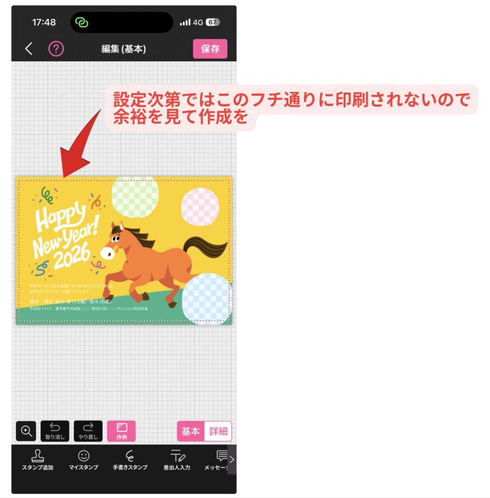 デザインソフトや年賀状アプリで作成する場合は、写真や文字が端ぎりぎりにならないように配置しましょう。