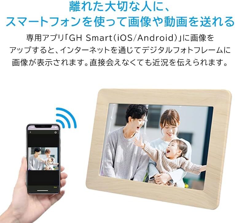 最近のデジフォトにはアプリ連携機能があるので、アプリを通じて遠く離れた親と写真の共有が可能です。